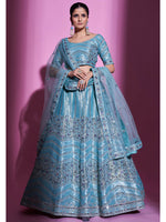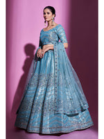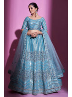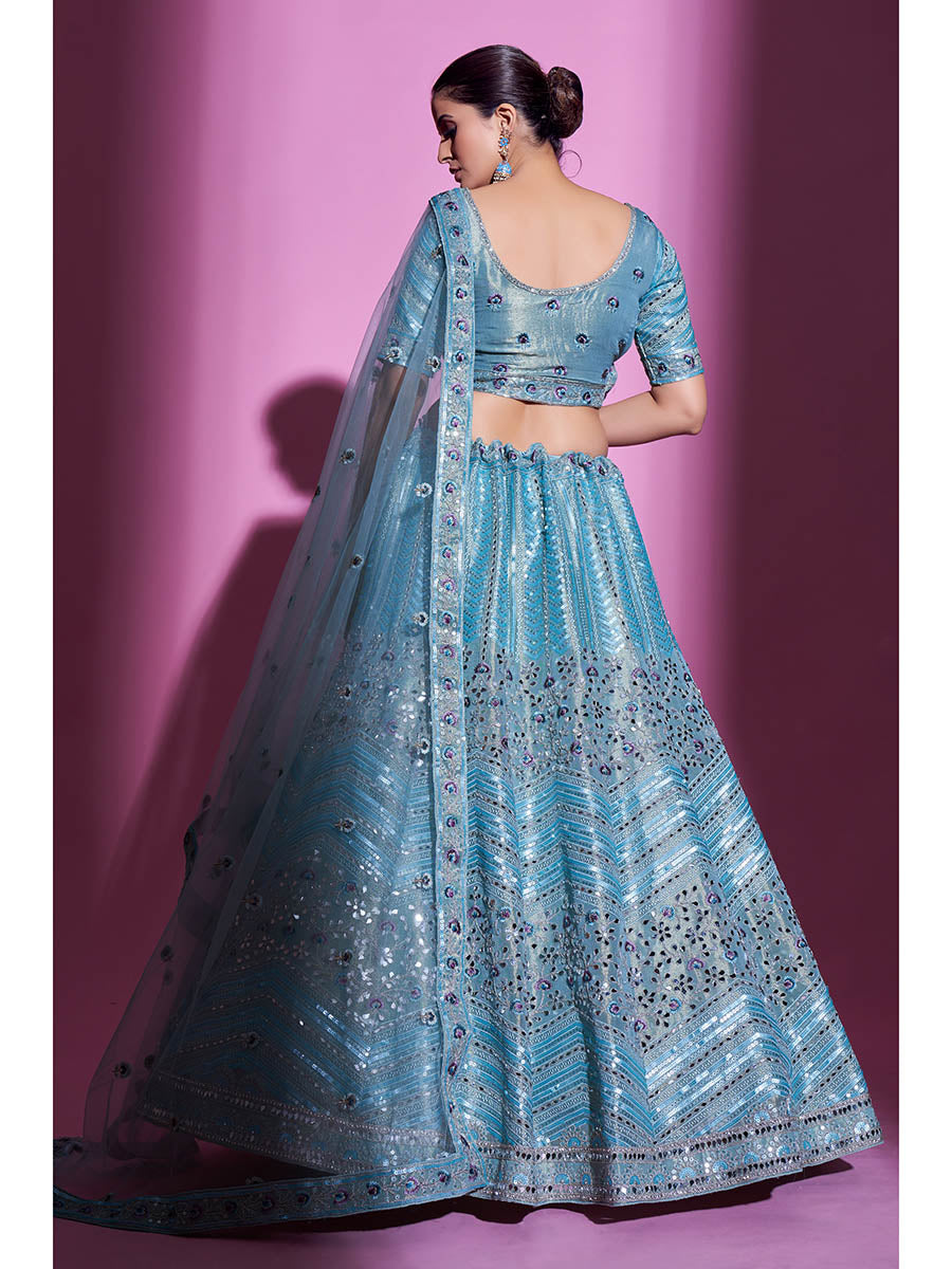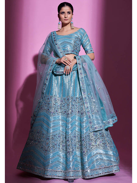 Firozi Gota Silk Embroidered Designer Lehenga Choli features a Gota Silk lehenga , Gota Silk choli and Soft Net dupatta. Embroidery is completed with Dori, Sequins and Mirror. This Style is made in India and checked by hand to ensure high quality.