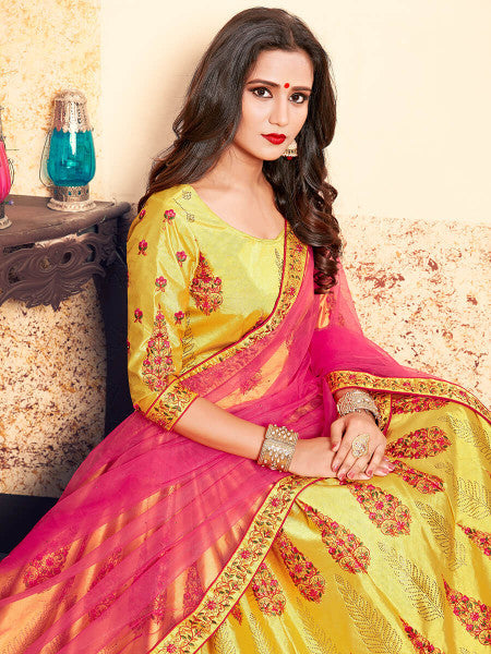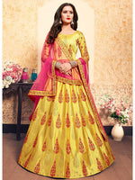 Yellow Satin Embroidered Lehenga features a Pure Satin top and bottom with santoon inner alongside a soft net dupatta. Theread & Swarovski is used for the embroidery of this style.