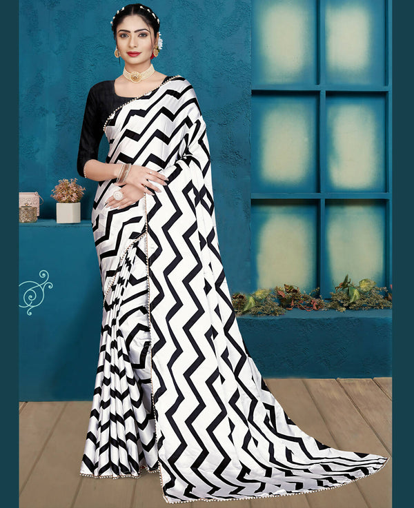 Black Japan Satin Stripe Printed Saree With Unstitched Blouse Piece - Laavanya About the product: This sarees is made of Japan satin fabric which ...