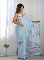 Design and style and trend would be at the peak of your splendor once you attire this sky blue chinon classic saree. You are able to see some fascinating patterns completed with digital print and mirror work. Comes with unstitched blouse. (Slight variation in color, fabric & work is possible. Model images are only representative.)Legal Disclaimer :Product color may slightly vary due to photographic lighting sources or your monitor settings.