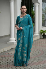 Vishnu Weaves Women's Firozi Linen Silk Zari Weaving Saree with Blouse