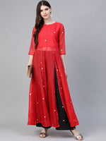 Refresh your wardrobe with this khadi print Red bandhej Kurta set from Ahalyaa. This regular kurta with palazzo set is a perfect partner for all your ethnic wear needs. You can team it up with silver jewellery & flat jutties. Kurta has a front slit, it creates a great look.