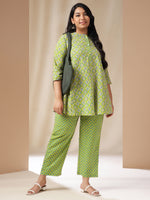 Janasya A-Line Cambric Lime Green Ethnic Motifs Band Collar Co-Ords - Distacart