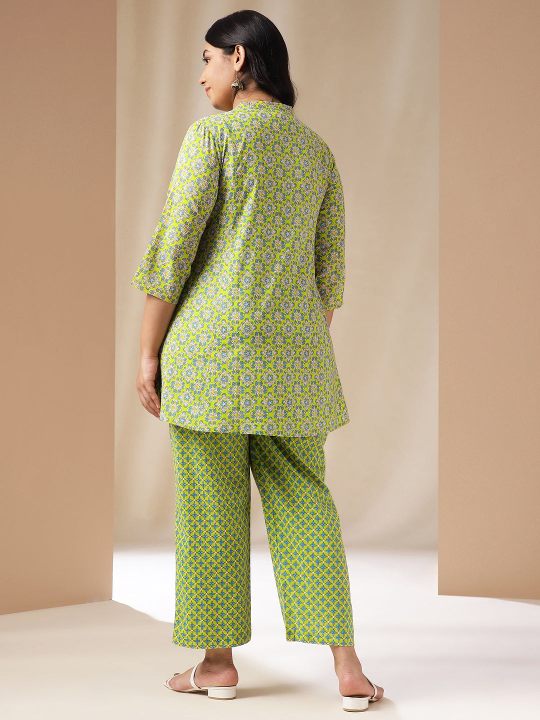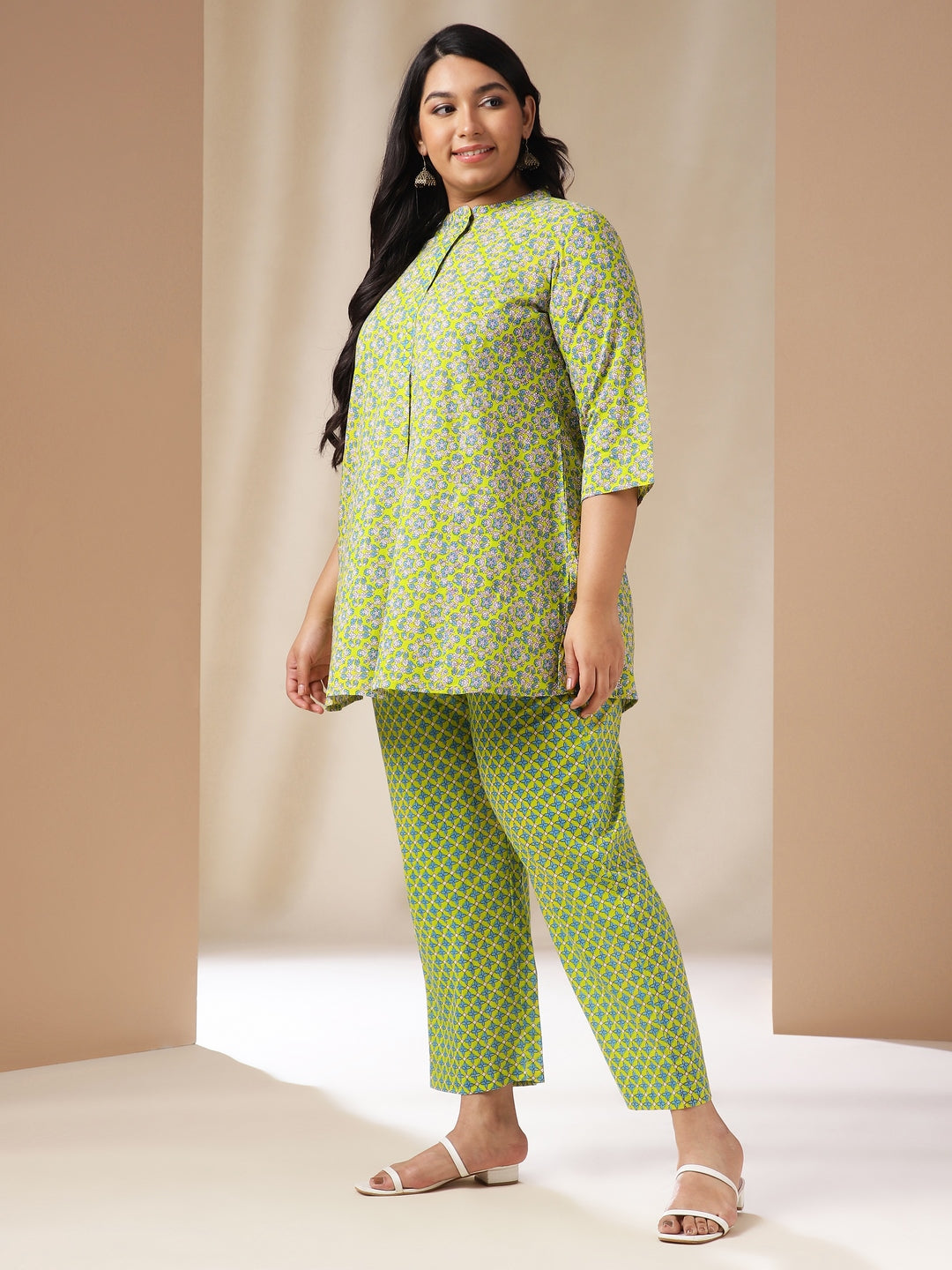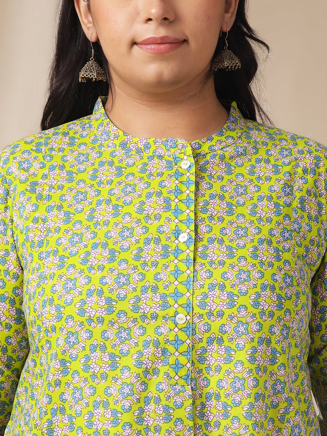 Janasya A-Line Cambric Lime Green Ethnic Motifs Band Collar Co-OrdsAbout the Product: Top Style Type: A-Line Top Fabric Details: Cambric Top Pri...