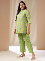 Janasya A-Line Cambric Lime Green Ethnic Motifs Band Collar Co-Ords - XXL
