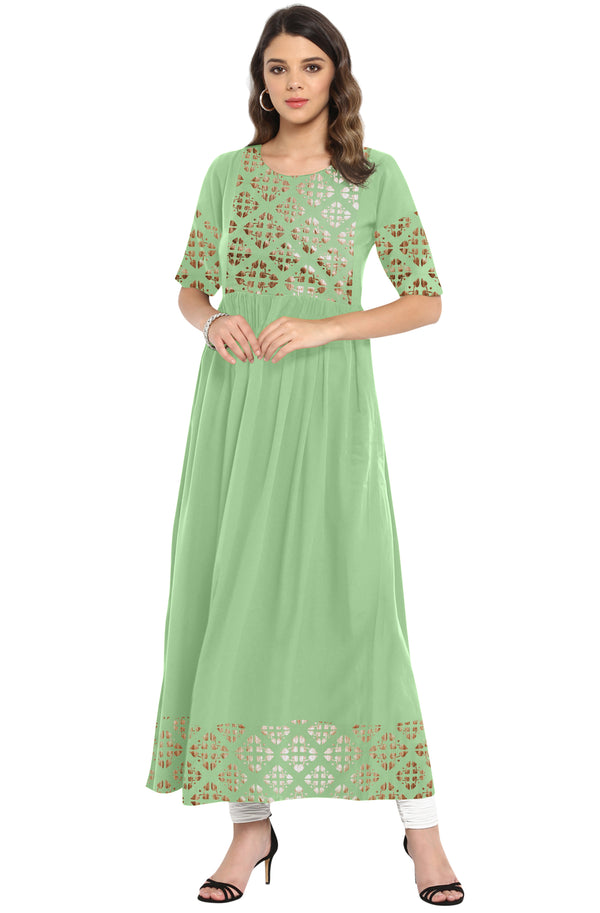 Janasya Light Green Poly Crepe Gold Print Flared kurta - Distacart