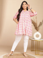 Janasya Pleated Cambric Pink Ikkat Notch Neck Tunic - 4XL