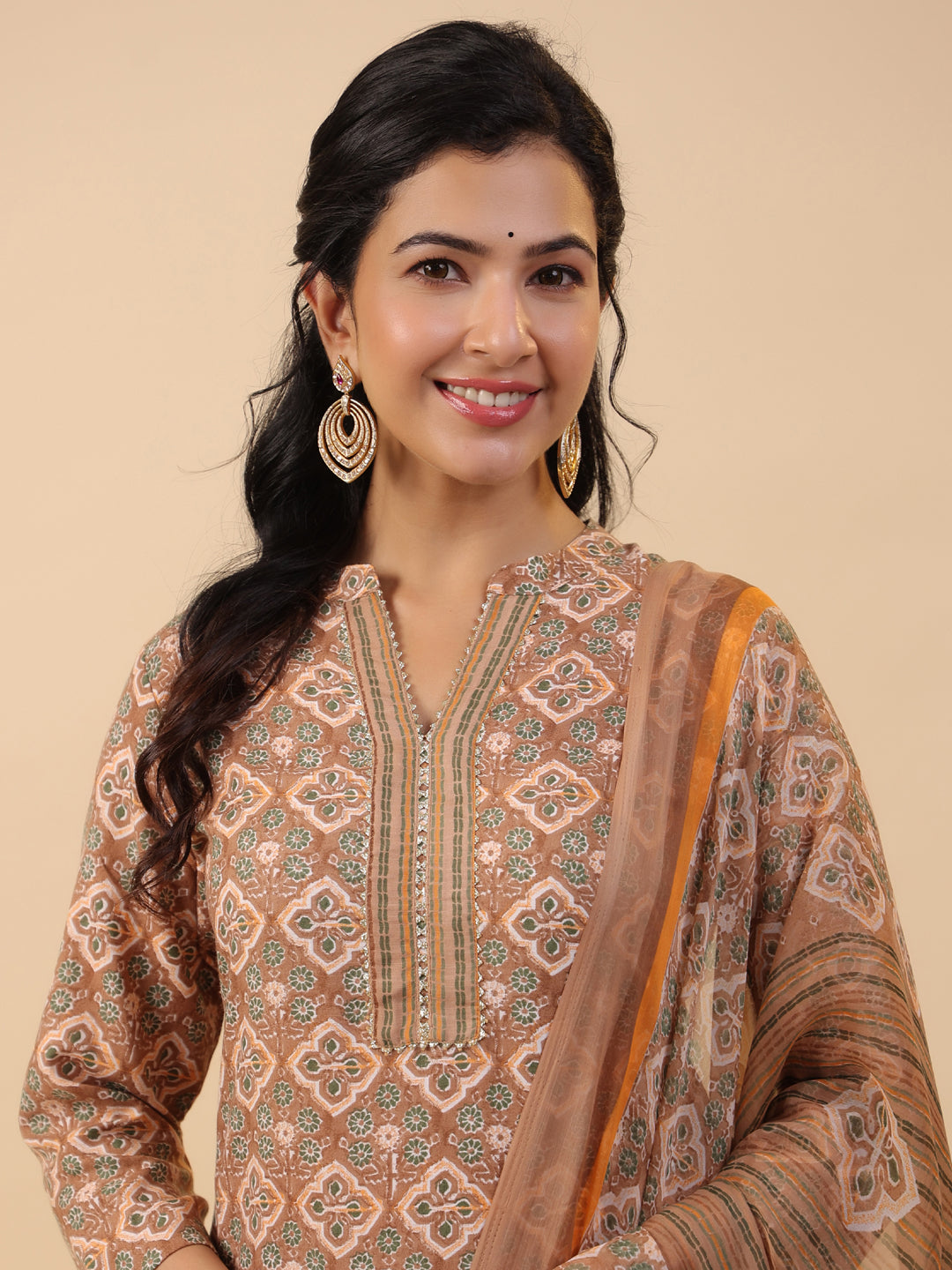Janasya Straight Biscuit Slub Brown Ethnic Motifs Band Collar Kurta,Bottom & Dupatta