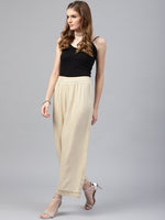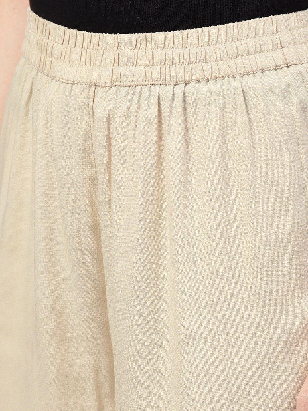 Beige solid rayon wide-leg palazzo, designed for daily wear. These ankle-length pants feature a slip-on style with an elasticated waistband for comfort and one pocket for convenience. The wide-leg design provides a relaxed and stylish look.