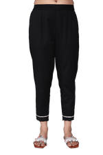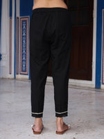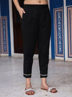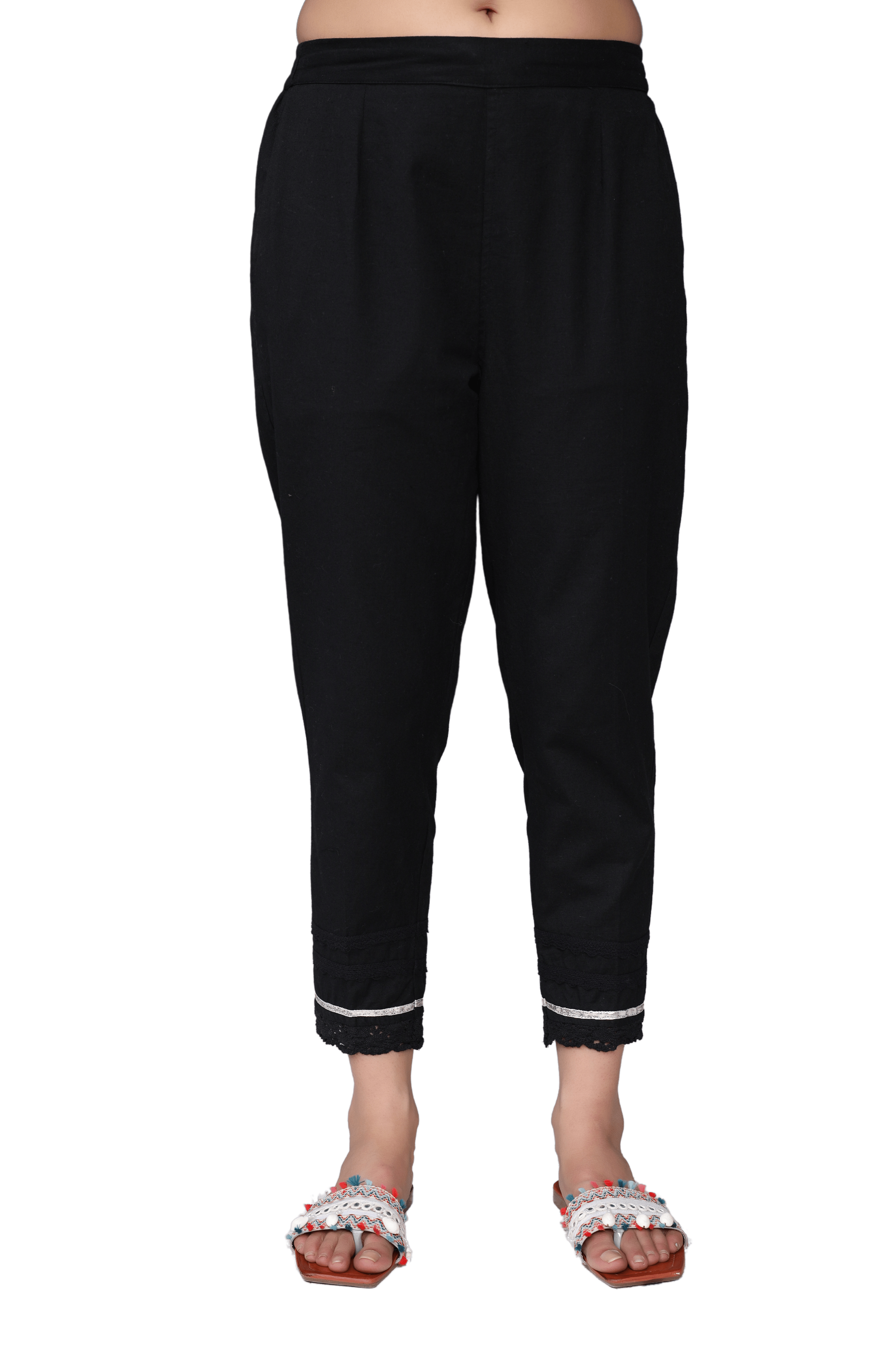 Black Women's Pants Crafted From Solid Cotton. These Slip-On Pants Feature A Partially Elasticated Waist For Comfort And Convenience. Complete With A Practical Pocket And Delicate Lace Detailing, They Offer Versatile Style And Effortless Elegance For Any Occasions.
