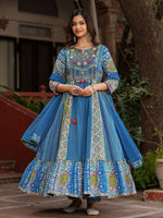 Juniper Blue Floral Printed Pure Cotton Anarkali Kurta Pants & Dupatta Set With Thread Work - M