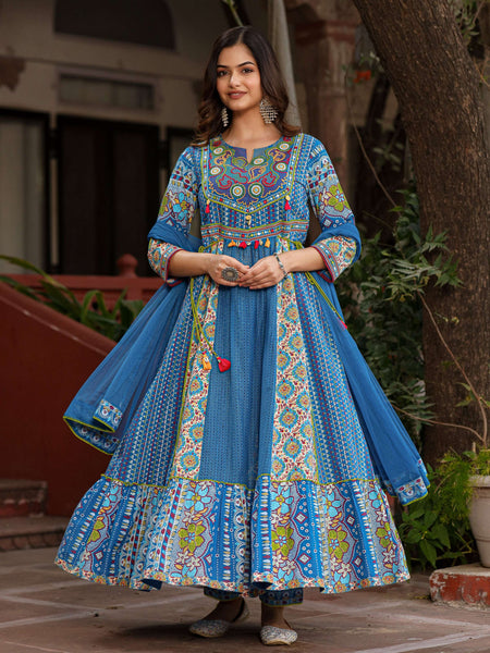 Juniper Blue Floral Printed Pure Cotton Anarkali Kurta Pants & Dupatta Set With Thread Work - Distacart