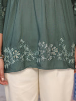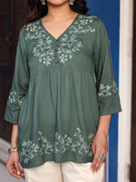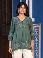 Green Modal Rayon Alia-Cut Embroidered Tunic. Features A V Neckline And Three-Quarter Regular Sleeves. Ideal For Daily Wear, Adding Elegance To Women's Wardrobes.