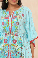 Juniper Sky Blue Floral Printed Calf-Length Rayon Kaftan.Sky blue floral printed rayon kaftan designed for daily wear. This calf-length kaftan has ...