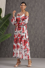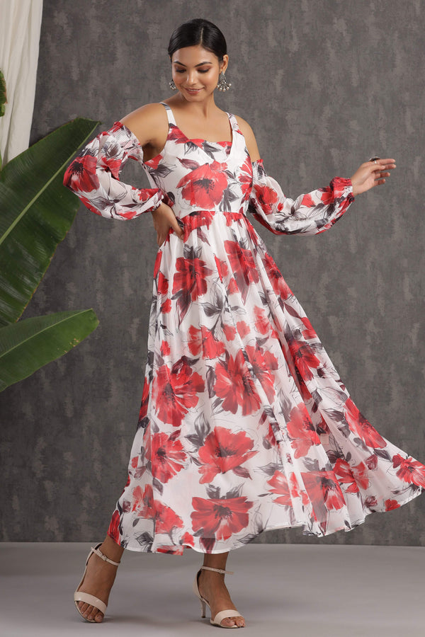 White Chiffon Maxi Dress With Adjustable Straps & Cold Shoulder. Features Floral Prints, Gathers, And A Curved Hemline, Hitting At Ankle Length. Fit & Flare Silhouette With A V Neckline And Long Balloon Sleeves. Includes A Zipper Closure, Suitable For Daily Wear.