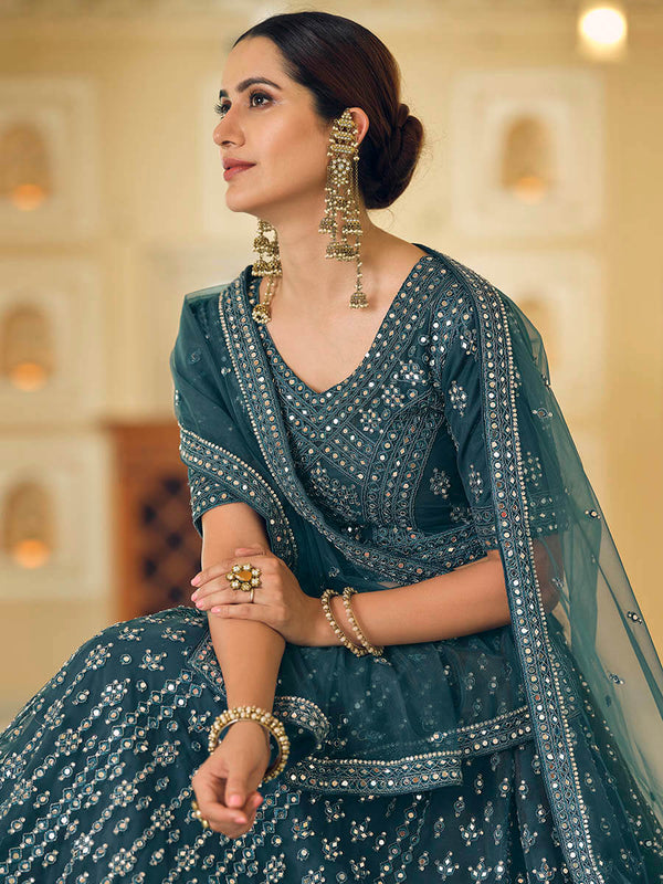 Rama Blue Soft Net Embroidered Lehenga Features a soft net blouse with soft net dupatta. Embroidery is completed with dori and mirror.This Style is made in India and checked by hand to ensure high quality.
