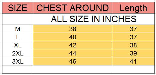 • Chest Size(in Inches) : 38(M), 40(L) 42(XL) 44(XXL) 46(3XL)