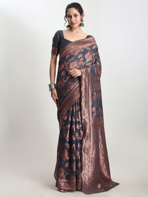 Janasya Dark Grey Silk Blend Floral Jacquard Saree