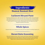 • COMPLETE SOLUTION : Contains Daawat Basmati Rice, Lucknowi Biryani Paste, Whole Spices and Burani Raita Seasoning