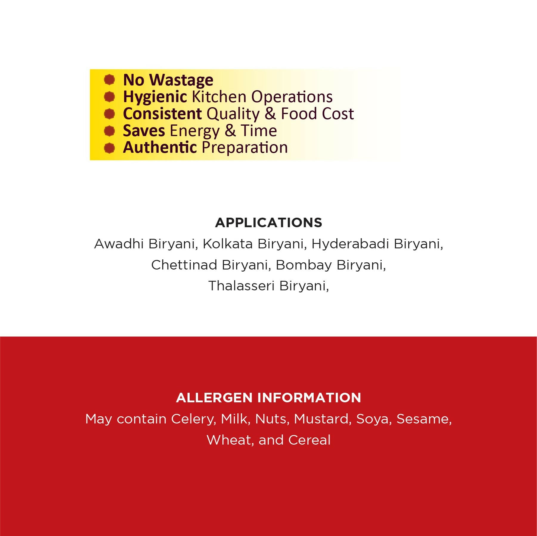• Aromatic Base: Biryani gravy serves as the flavorful base for biryani, a popular and aromatic rice dish. Comprises a blend of spices, herbs, and other ingredients to create a rich and savoury flavour profile. No Preservatives. No Artificial Color/Flavour.
