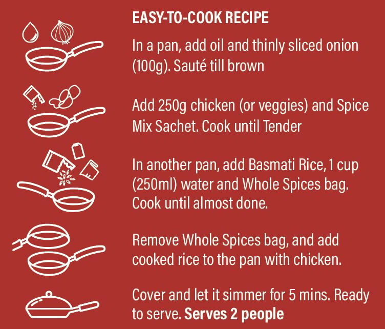 • SIMPLIFY COOKING Our kit makes it easy and convenient to cook traditional Chicken or Vegetable Biryani without the need for additional spices. Just follow the easy-to-cook recipe on the pack and impress your family and friends with restaurant-quality taste in the comfort of your home.