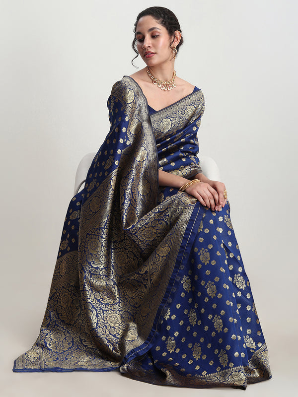 Janasya Blue Silk Blend Floral Jacquard Saree