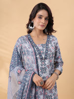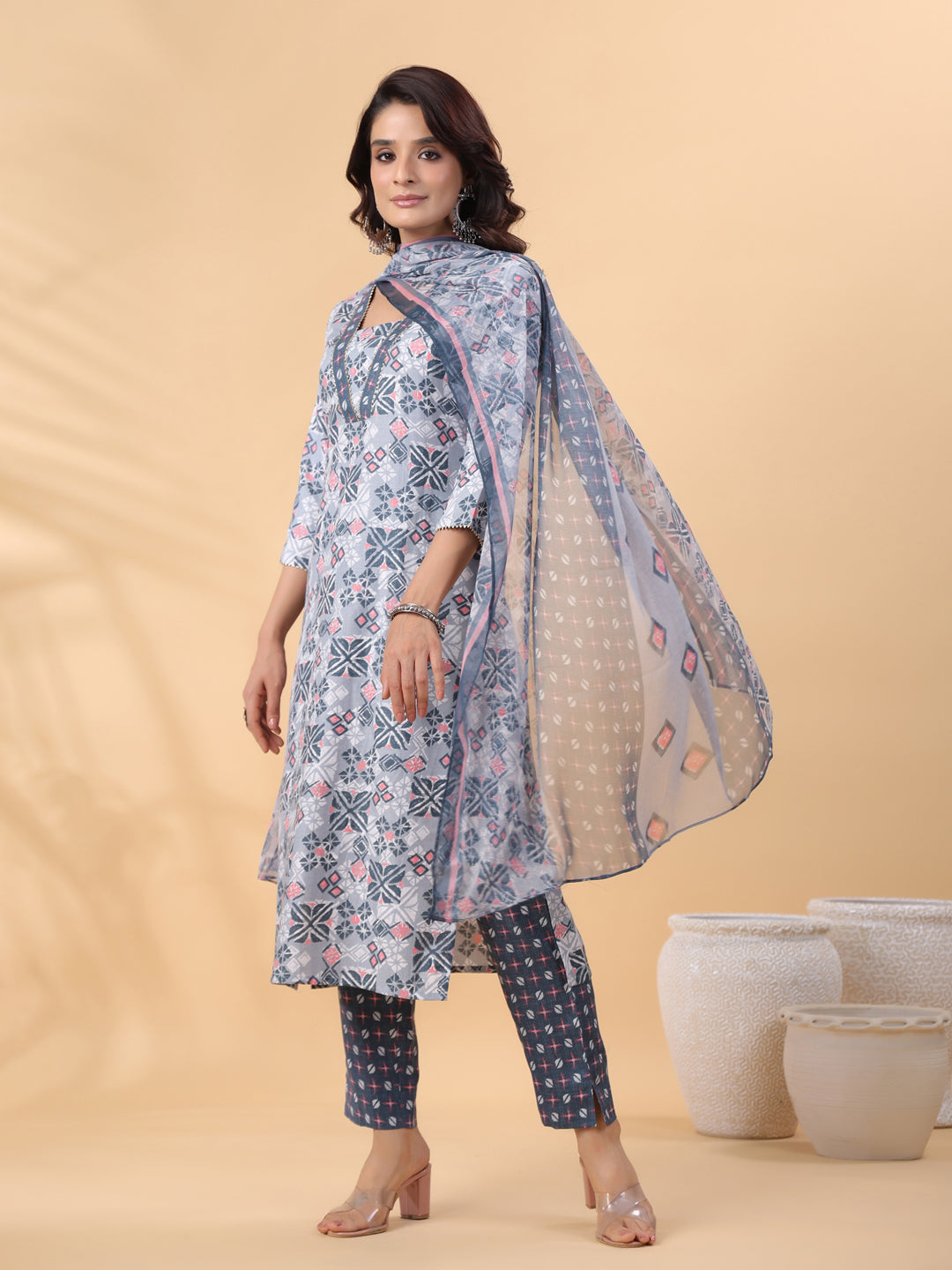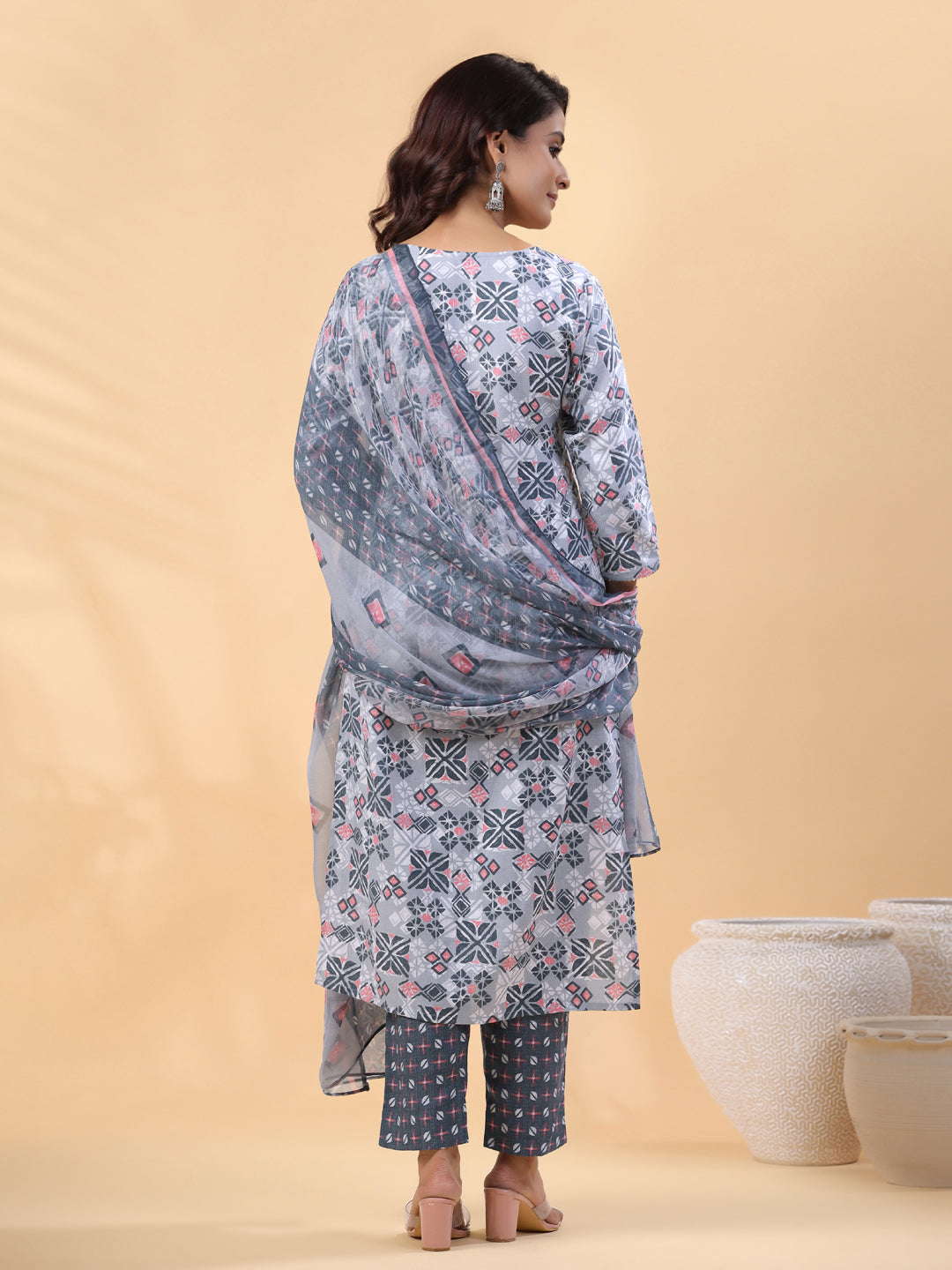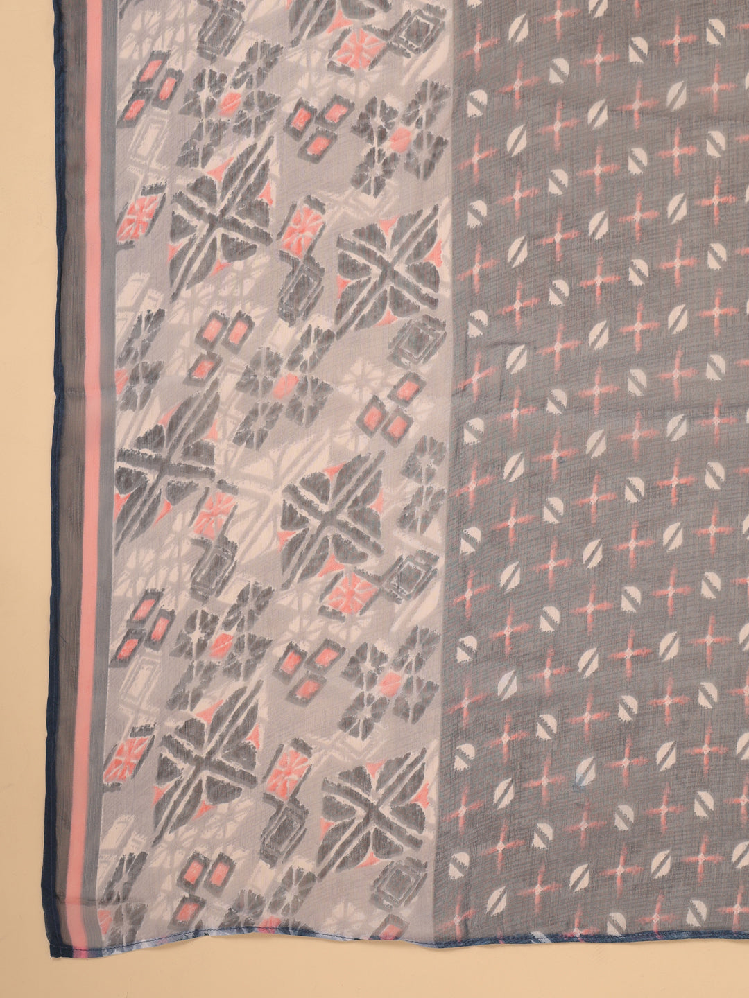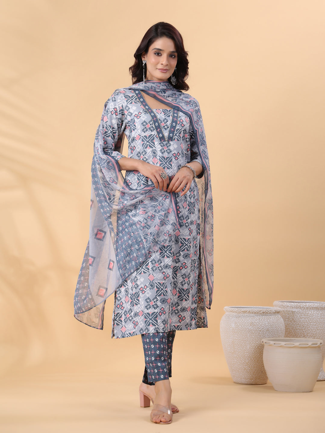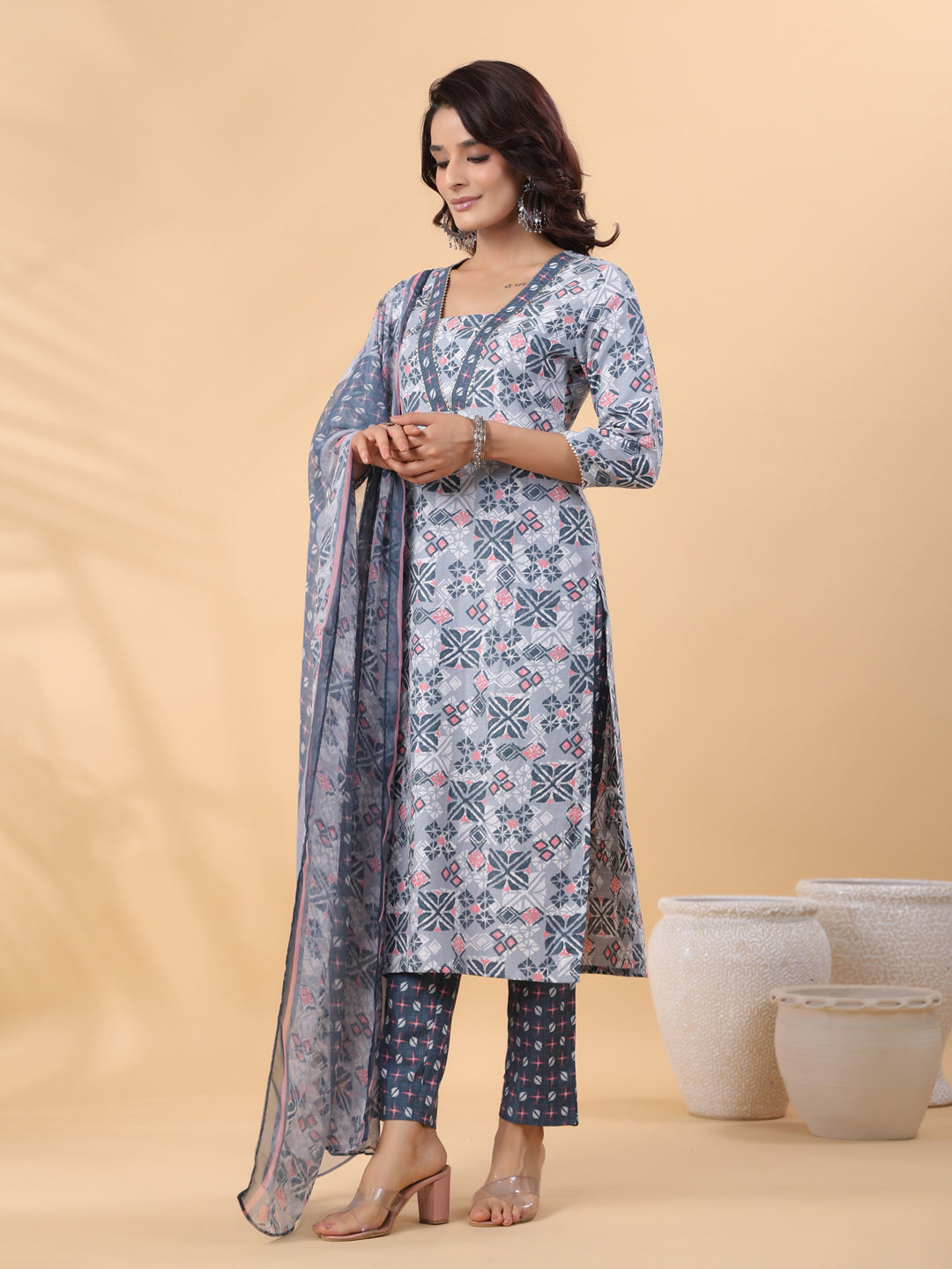 Janasya Regular Biscuit Slub Grey Gemometric Square Neck Kurta,Bottom & Dupatta - Distacart