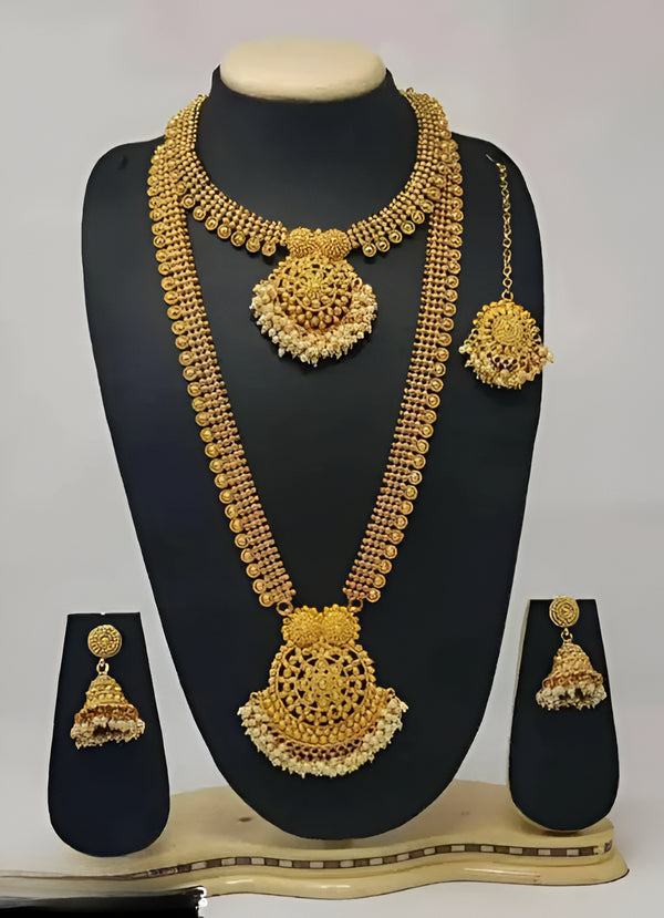 Jewel City Luxurious Gold-Plated South Indian Bridal Jewelry Set - Necklace, Long Chain, Earrings, and Tikka Color: Gold Material: Alloy Elevate ...