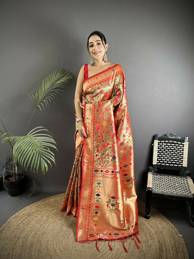 Vedant Vastram Soft Litchi Silk Paithani Silk Saree - Red - Distacart