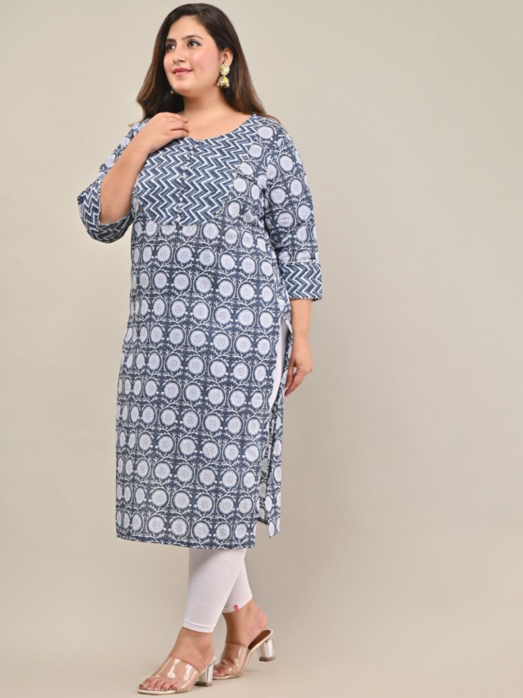 Swasti Women Plus Size Navy Blue Floral Printed Cotton Kurta Product Details Colour: navy blue floral printed round neck third quarter, regula...