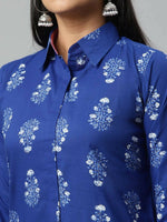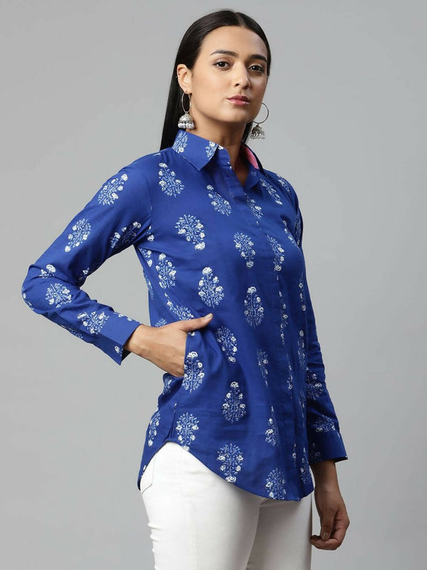 Royal Blue-Coloured Crepe printed tunic, has a Shirt Collar, Three-Quarter Sleeves, and Hip Length Taking the bright colours of summer and nature, Ahalyaa inspires the Women of style and substance to experiment with a range of colours and vibrant shades. To match the shade to your personality! Mix and match from a variety of colours and prints for a feminine look, or a modern twist.