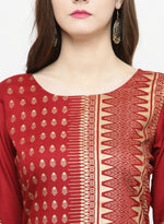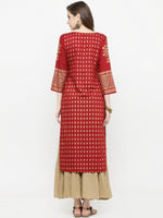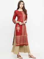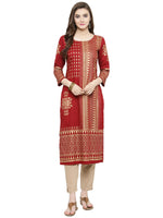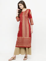 Maroon printed straight kurta, has a round neck, three-quarter sleeves, straight hem, side slits.