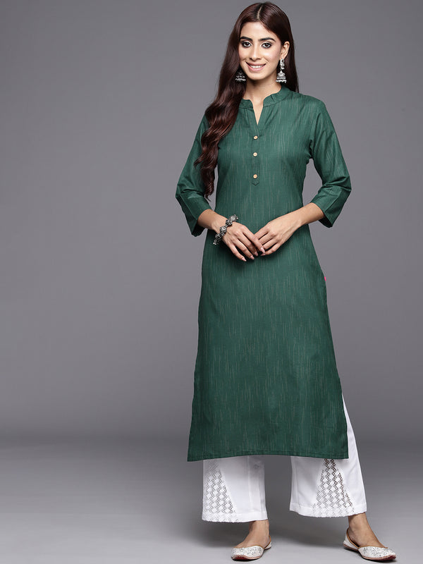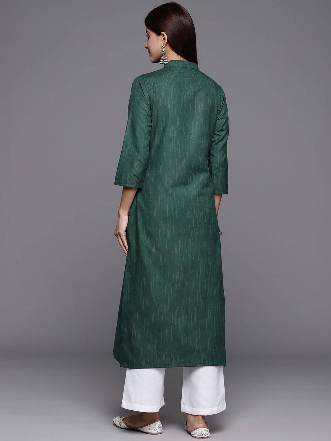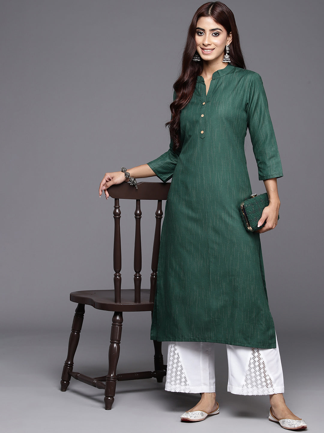 Varanga Women Sea Green Woven Straight KurtaSea Green Woven Mandarin Collar With Placket, Three Quarter Sleeve Straight KurtaAbout the Product: Pa...