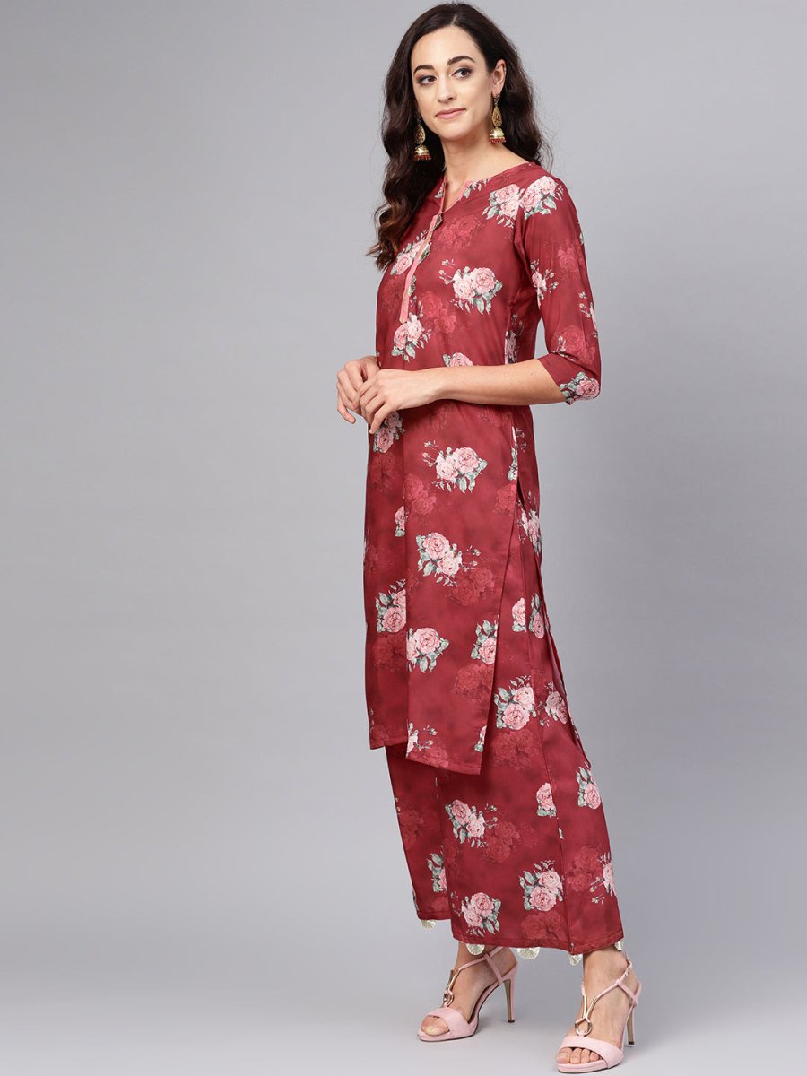 Ahalyaa Women Maroon Printed Kurta with Palazzo & DupattaThis Kurta set by Ahalyaa is a 3pc number. The kurta has a floral printed top and bott...