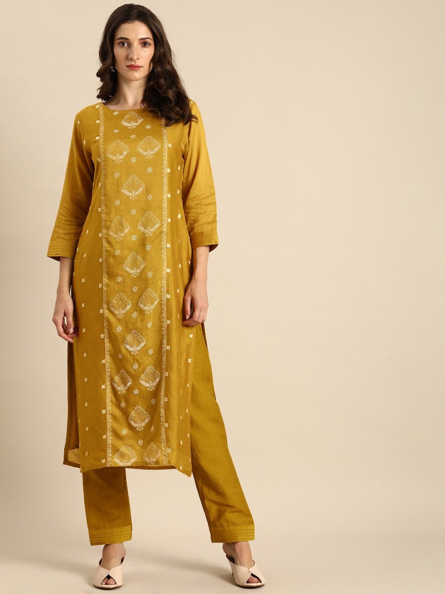 All About You Women Mustard Yellow & Off-White Ethnic Motifs Embroidered Kurta Set Product Details Mustard yellow and off-white embroidered ...