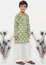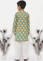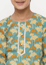 Little Bansi Cotton Bird Print Kurta with Pearl Buttons and Pyjama -Blue and Cream