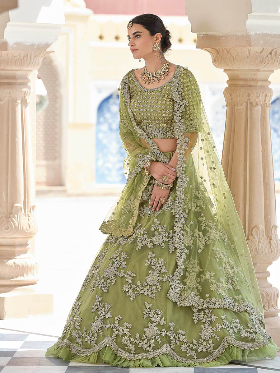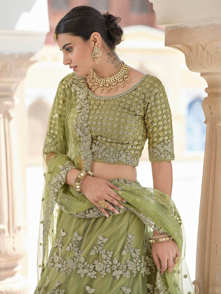 Myra Olive Green Net Embroidered Lehenga - Distacart