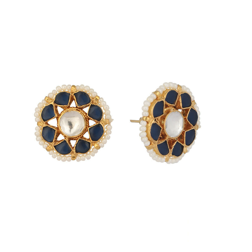 22K Gold-toned elegant studs feature a delicate floral design crafted with classic blue stones. The minimal style is enhanced by pearl details, adding just the right touch of charm and grace. Perfect for everyday elegance or pairing with traditional outfits for a subtle statement. Secured with push back closure. This comes with and hypoallergenic for lasting shine and comfort.