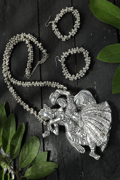 Mominos Fashion Johar Kamal Oxidised Silver-Plated Brass Finish Radha Kishan Long Necklace For Women Style/Collection: Oxidised Actual Color: Sil...