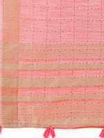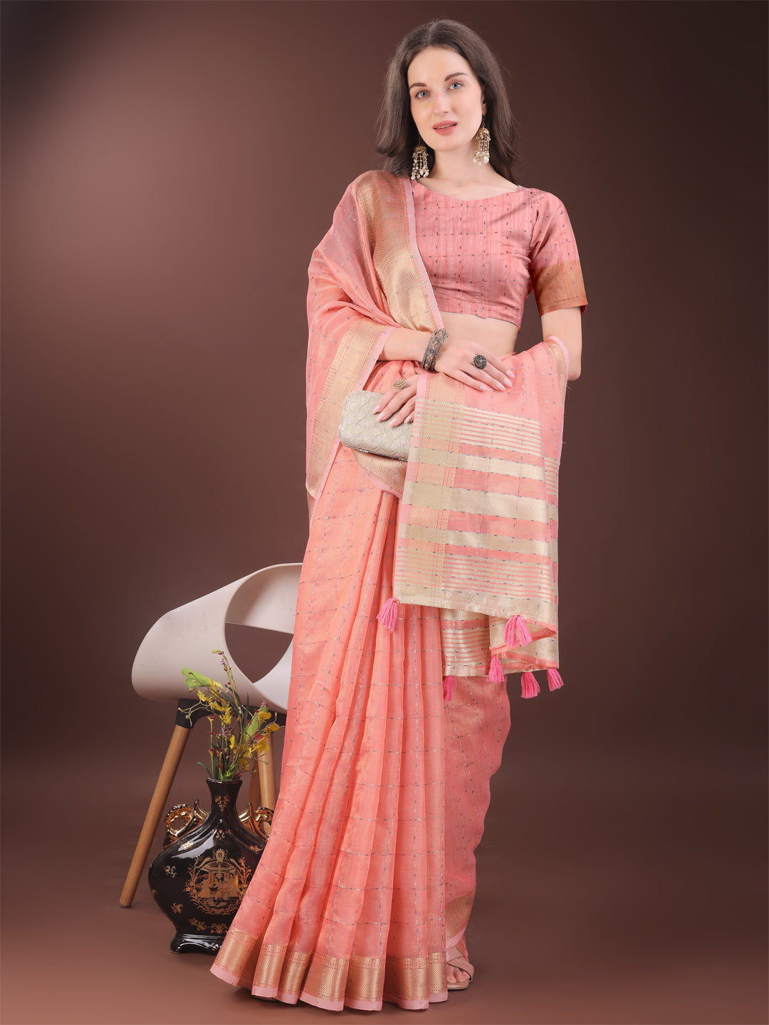 Astita Elegant Peach Organza Saree with Golden Zari Border & Designer Tassels | Lightweight Partywear Saree - Distacart