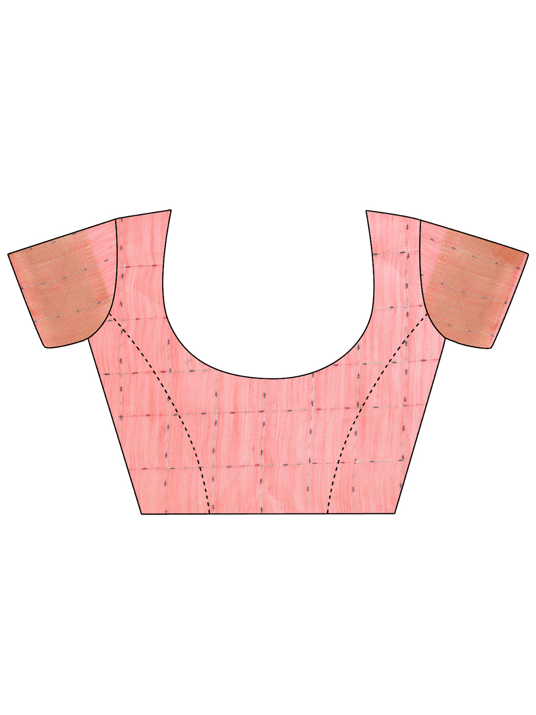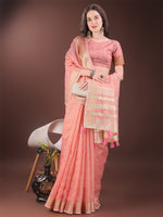 This Peach organza saree is a blend of modern sophistication and traditional charm. Crafted from feather-light organza fabric, it features a golden zari border and delicate tassels on the pallu. Perfect for festive occasions, weddings, or elegant parties, this saree offers a luxurious look while being breathable and easy to wear. A matching unstitched blouse piece is included to complete your ensemble.