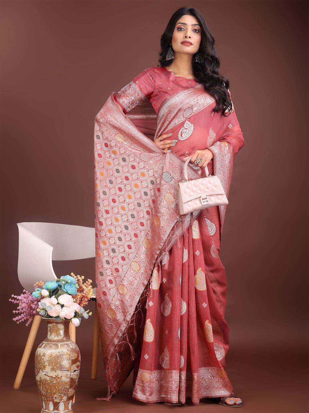 Step into subtle elegance with this Pink linen cotton saree, beautifully adorned with intricate woven motifs and a refined zari border. The airy comfort of linen blends seamlessly with the soft touch of cotton, creating a graceful ensemble perfect for workwear sophistication or light festive gatherings. A timeless piece that radiates charm and effortless poise.