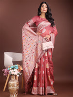 Astita Elegant Pink Linen Cotton Saree with Zari Border & Woven Motifs - Perfect for Sophisticated Everyday & Festive Looks - Distacart
