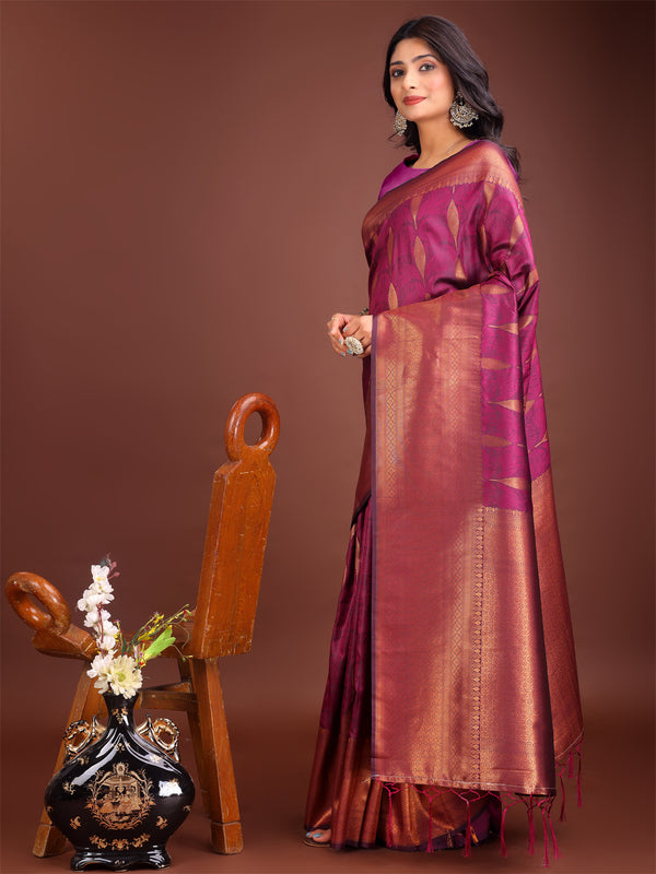 Elevate your ethnic wardrobe with this Purple linen cotton saree featuring golden zari woven leaf motifs and an elegant pallu. Crafted for comfort and style, this saree is ideal for festive wear, office meetings, or casual elegance. Comes with a matching blouse piece to complete your traditional ensemble.