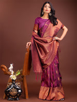Astita Purple Linen Cotton Saree with Golden Zari Leaf Woven Design & Rich Pallu - Festive Wear | Office Look | Soft Drape - Default Title