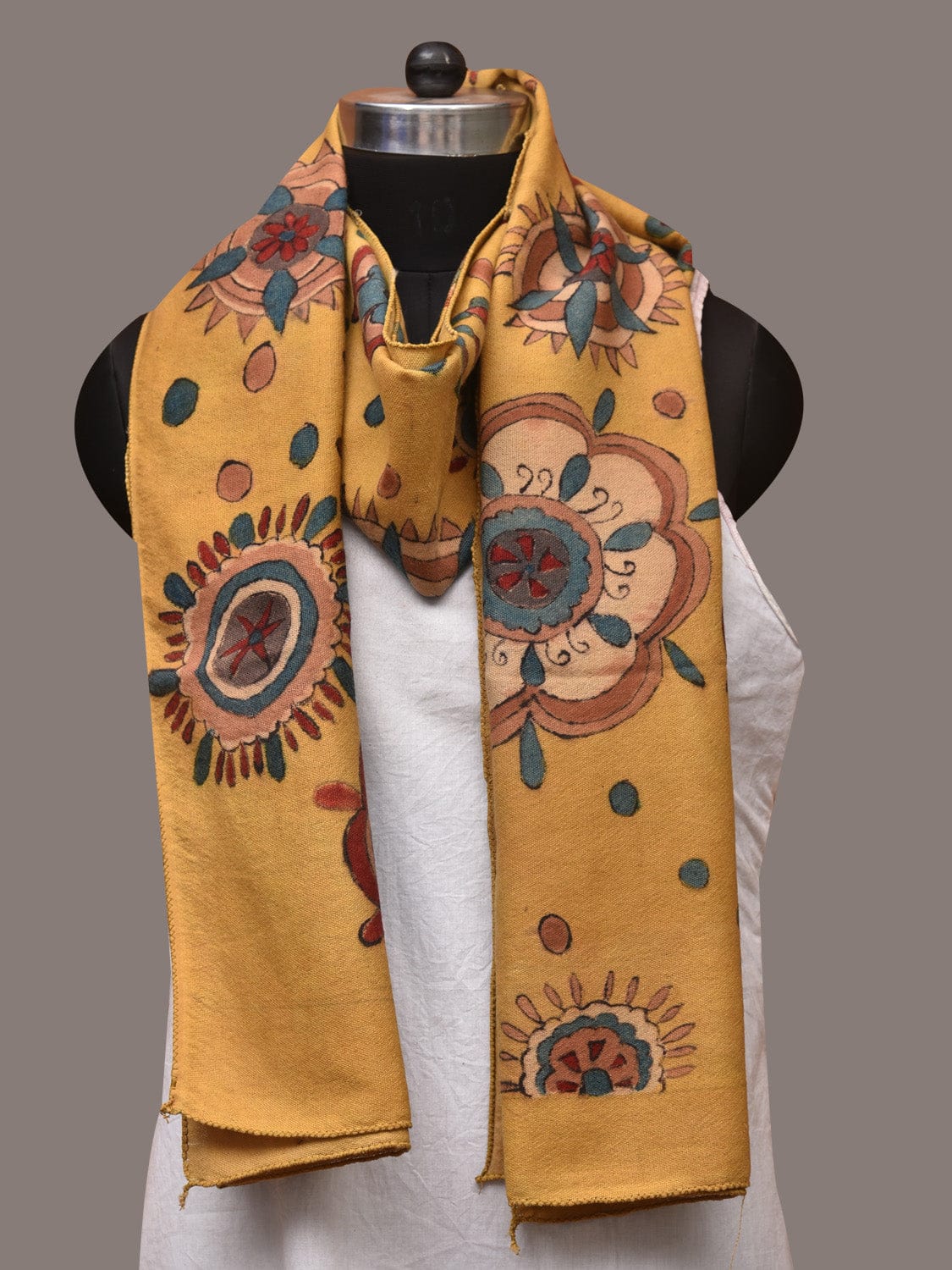 Yellow Kalamkari Hand Painted Woolen Handloom Stole with Floral Design. This hand painted kalamkari is done using natural dyes. As they are natural colors they bleed with initial washes, so we suggest Dry clean.
