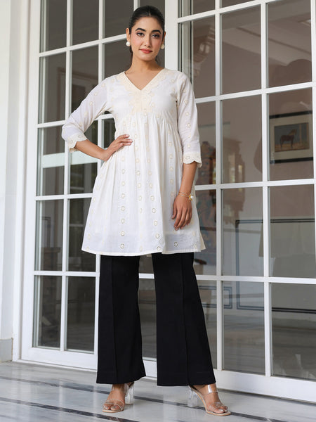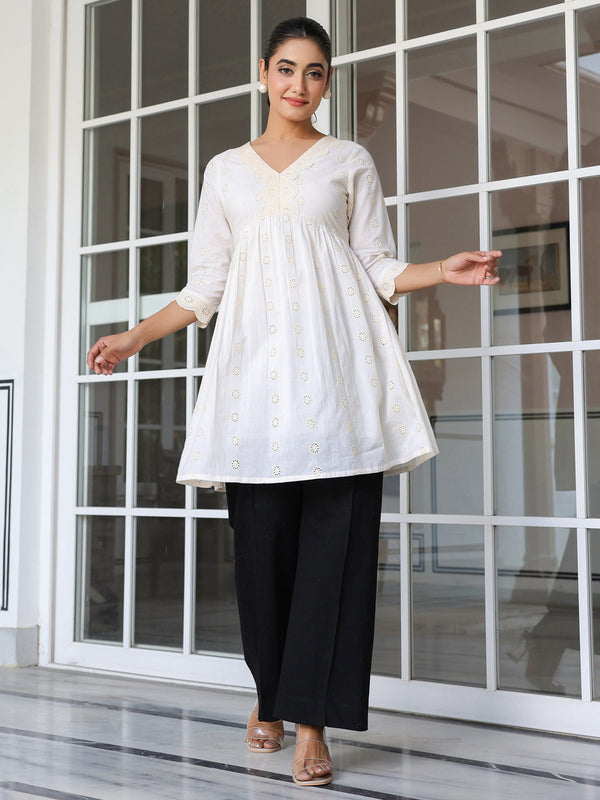 Janasya Light Cotton Schiffli ALine Tunic Top Fabric: Cotton Top Style: ALine Top Color: Light Top Pattern: Schiffli Top Neck: VNeck Top Slee...