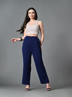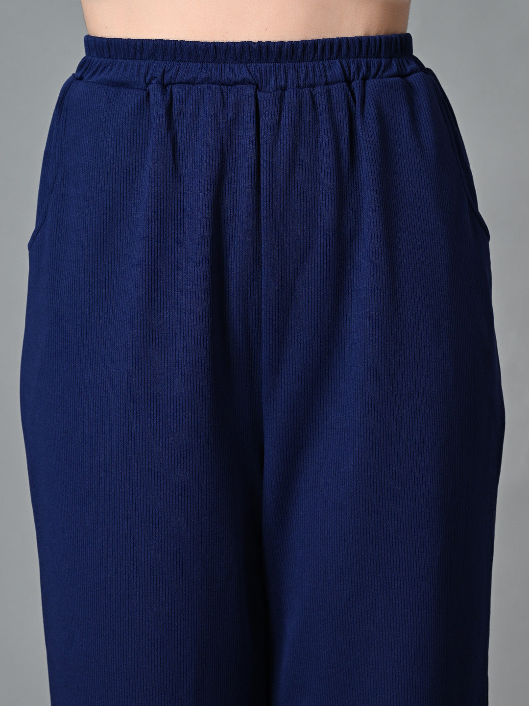 Myshka Women's Solid Ribbed High-Rise Wide Leg Casual Trousers in Navy Blue Color