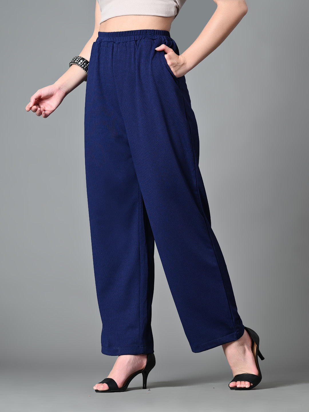 Myshka Women's Solid Ribbed High-Rise Wide Leg Casual Trousers in Navy Blue Color - Distacart