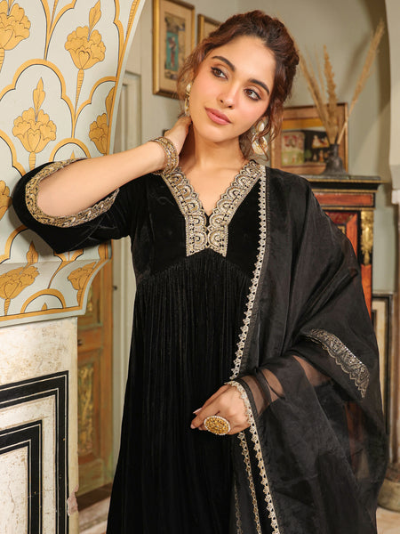 Janasya Black Velvet Embroidered Kurta,Bottom & DupattaAbout the Product: Top Style Type: Gathered Top Fabric: Velvet Top Primary Color: Bla...